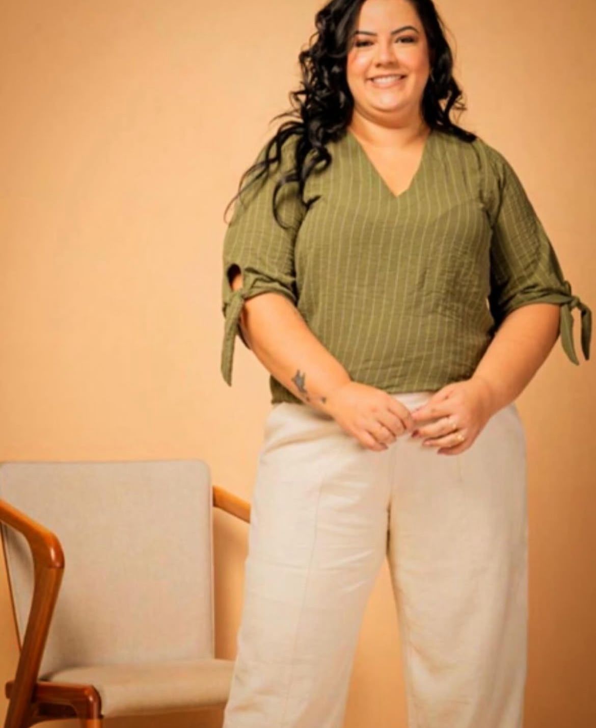 Uma blusa listrada Plus Size com gola em V e risca de giz tem um design que mistura estilos clássicos com um toque moderno e leve. O verde traz frescor e pode variar em tonalidades, modelo disponível no preto ,com listas brancas . A gola em V destaca o pescoço e dá um toque sutilmente feminino, sendo perfeita para valorizar acessórios como colares delicados. O corte da blusa pode ser levemente solto, com um tecido fluido como algodão ou viscose, conforto conforto e um caimento.