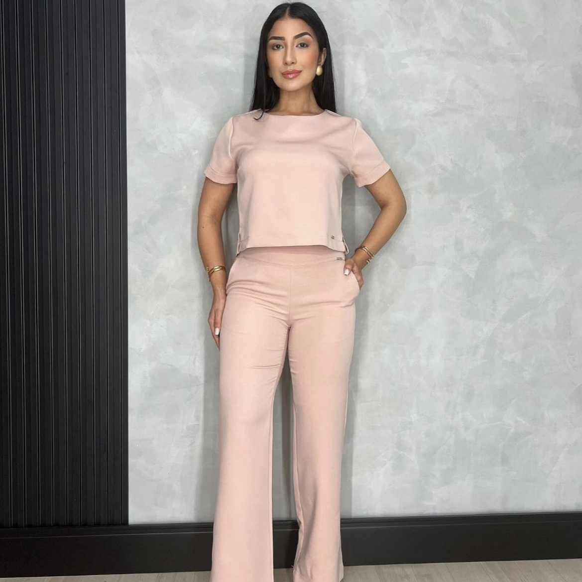 Um conjunto sofisticado e diferenciado composto por calça e blusa, com um detalhe especial de botões na parte de trás da blusa. A blusa apresenta um design minimalista na frente, enquanto os botões nas costas adicionam um toque inesperado e elegante, trazendo um charme exclusivo ao conjunto. A calça possui um corte reto e confortável, proporcionando um caimento perfeito e acompanhando a silhueta. Esse conjunto é ideal para quem busca um visual refinado e moderno, podendo ser usado tanto em benefícios formais quanto em momentos descontraídos.