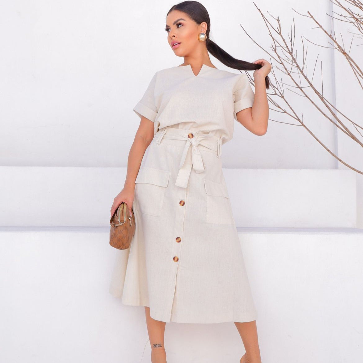 O conjunto de linho com saia de botões e blusa é uma escolha de estilos que combina o elegante do linho com um toque moderno e prático. A saia com botões frontais, além de ser um detalhe charmoso, agrega funcionalidade e um visual vintage, que remete a uma estética retrô chique. Esse tipo de saia geralmente tem um caimento reto ou em A, conforto um look feminino e sofisticado, ao mesmo tempo em que garante conforto e liberdade de movimento. A blusa de linho que acompanha o conjunto pode variar em modelos, mas costuma seguir uma linha minimalista e elegante, seja com mangas curtas, compridas ou até mesmo sem mangas. A simplicidade da blusa equilibra o visual, deixando o destaque para os botões da saia, enquanto mantém o ar de frescor característico do linho. Esse conjunto é versátil, perfeito para dias quentes, já que o linho é um tecido que permite a pele respirar. Ele pode ser usado em benefícios formais e informais, dependendo dos acessórios e calçados escolhidos. Para um look casual, rasteiras e acessórios naturais, como bolsas de palha, são ideais. Já para uma composição mais sofisticada, saltos e joias delicadas podem elevar o visual.