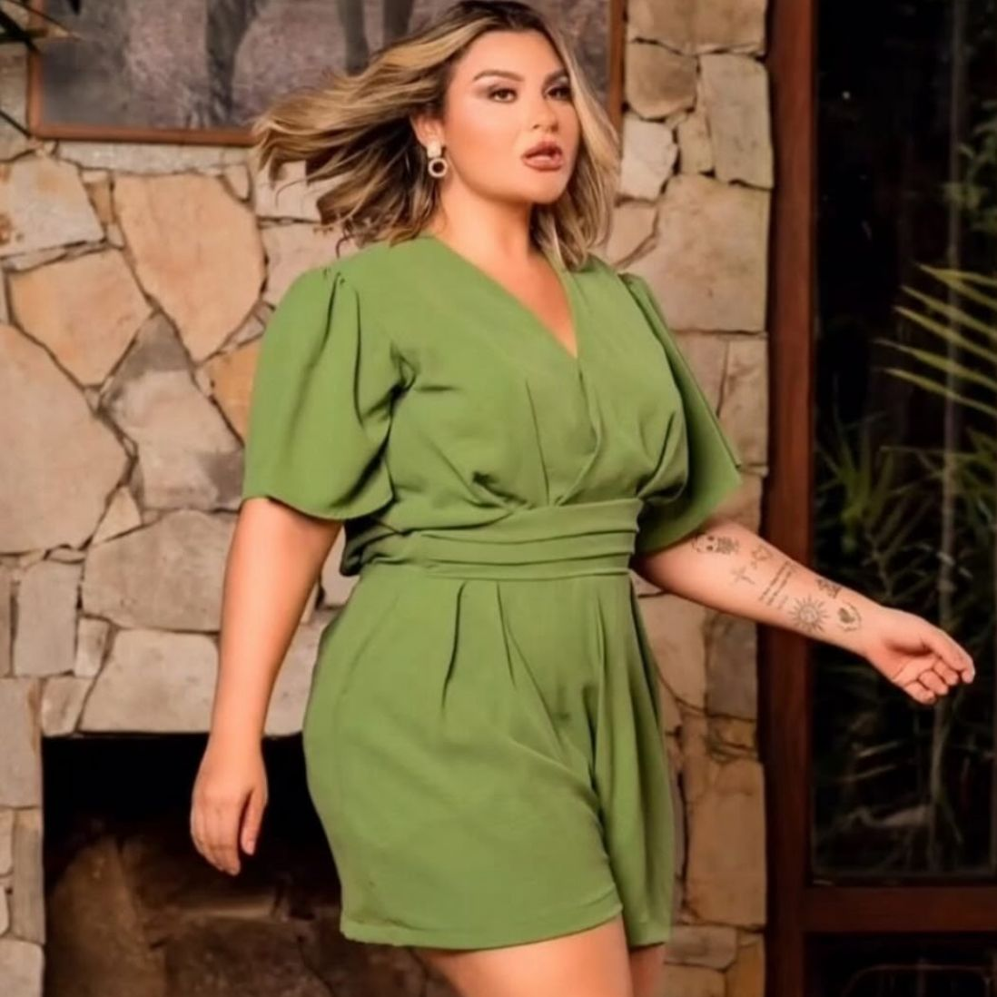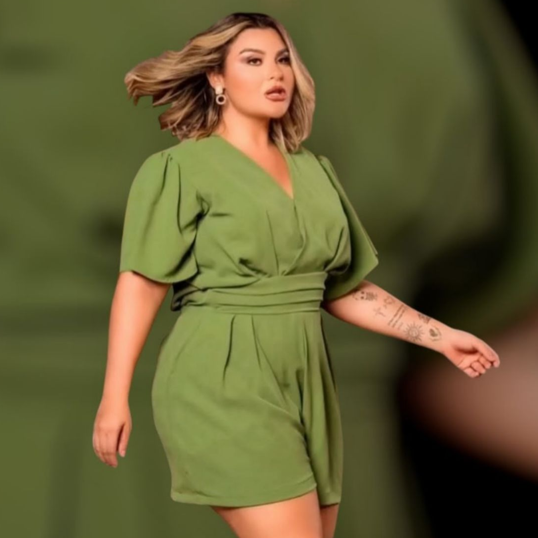 Este macacão é uma peça estilosa e versátil, que traz frescor e muita elegância ao look. Com um design moderno, ele possui mangas amplas e fluidas, conforto e liberdade de movimento. O decote em “V” junto à silhueta, e a faixa na cintura ajudam a definir as formas do corpo, criando uma estrutura elegante e valorizando as curvas. A modelagem levemente soltinha e o comprimento curto conferem um ar descontraído, ideal tanto para eventos casuais quanto para sofisticados mais sofisticados.