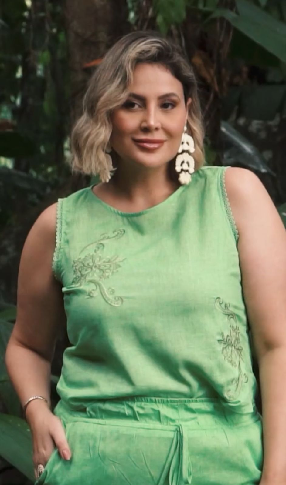 A regata com detalhes bordados é uma peça delicada e elegante, ideal para compor looks casuais ou sofisticados. Confeccionada em tecido leve, ela apresenta um design versátil com cortes simples, destacando os bordados personalizados, adicionando charme e personalidade. Perfeita para usar nos dias quentes, combina facilmente com peças em alfaiataria, jeans, shorts, ou saias, criando um visual moderno e feminino.