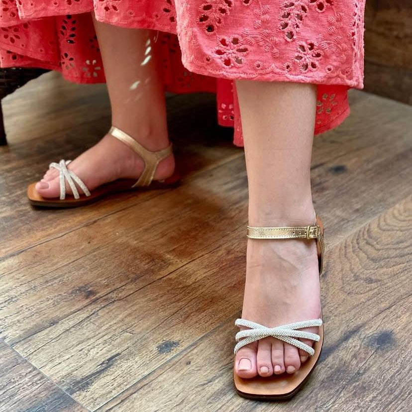 "Sandália deslumbrante com tiras transpassadas delicadas e adornadas com strass, proporcionando um toque de brilho e sofisticação ao seu visual. Com design moderno e elegante, é perfeita para ocasiões especiais, garantindo estilo e conforto em cada passo, tornando-a ideal tanto para festas quanto para eventos mais casuais.