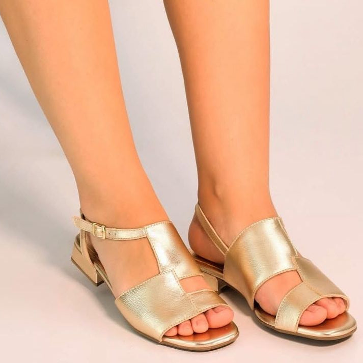 Sandália de couro dourada, elegante e sofisticada, perfeita para qualquer ocasião. Confeccionado em couro de alta qualidade, oferece durabilidade e conforto aos seus pés. Seu design moderno conta com um pequeno salto, e acabamento metalizado que adiciona um toque de glamour ao seu look. Ideal para combinar com vestidos, saias ou calças, essa sandália é uma escolha certa para quem busca estilo e características.