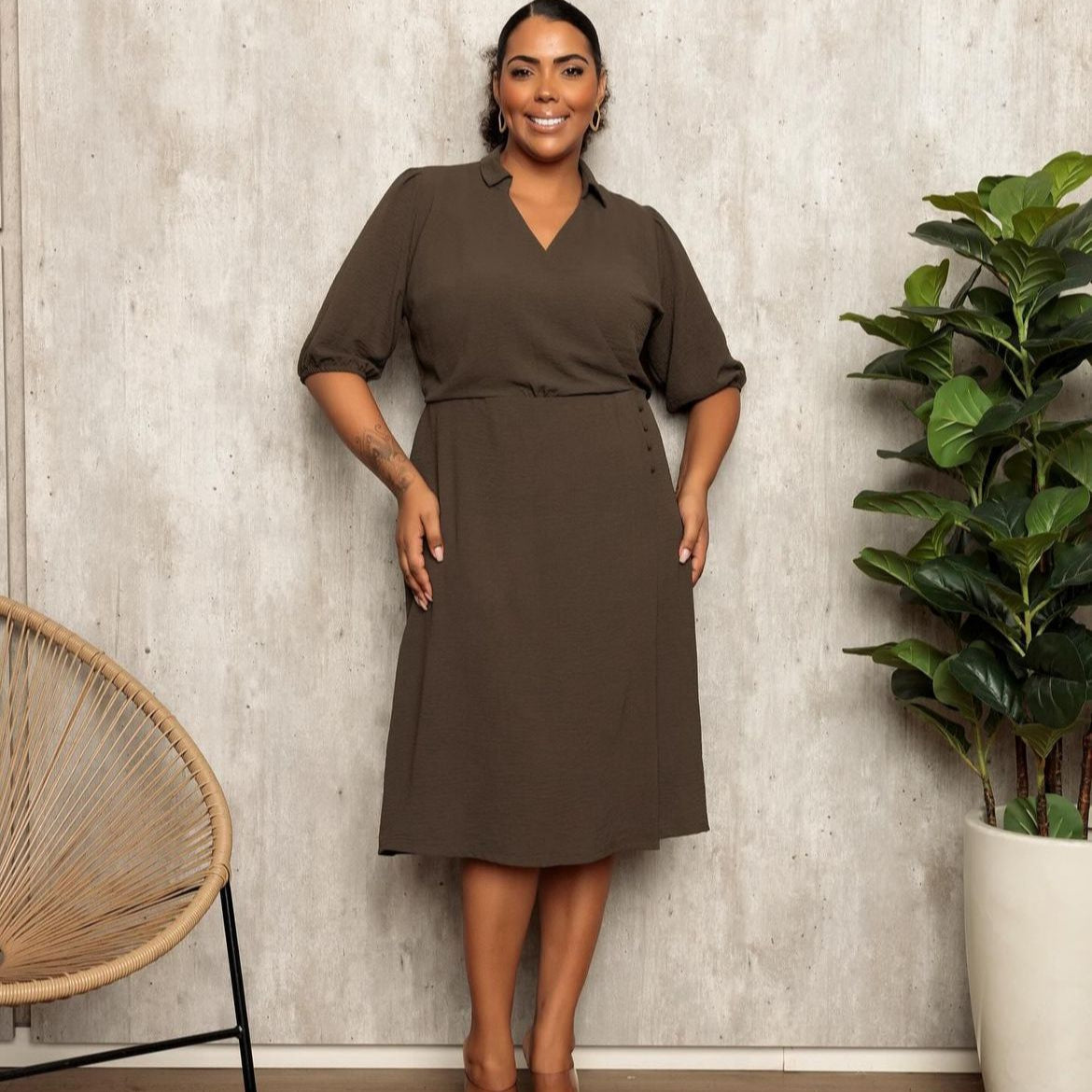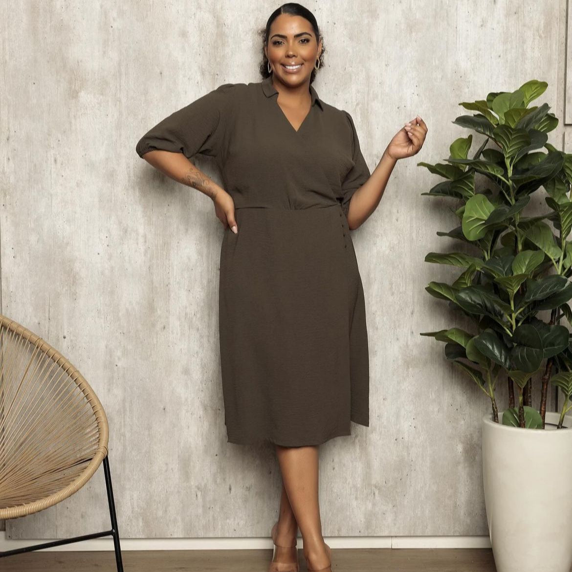 Este vestido apresenta um estilo casual e elegante, ideal para o dia a dia ou graças mais descontraídas. Ele é confeccionado em tecido leve de cor neutra, com uma modelagem que valoriza o corpo de forma suave. O decote transpassado em "V" proporciona um visual alongado e moderno, enquanto os mangas 3/4 com leve volume dão um toque de feminilidade. A saia em comprimento midi oferece uma combinação perfeita de estilo e conforto, sendo compatível tanto para momentos informais quanto para eventos mais sociais. Combinado com simplicidade e sofisticação, destacando-se por ser ao mesmo tempo versátil.